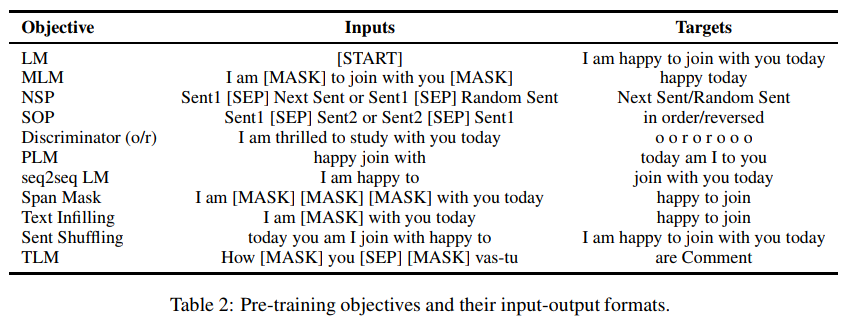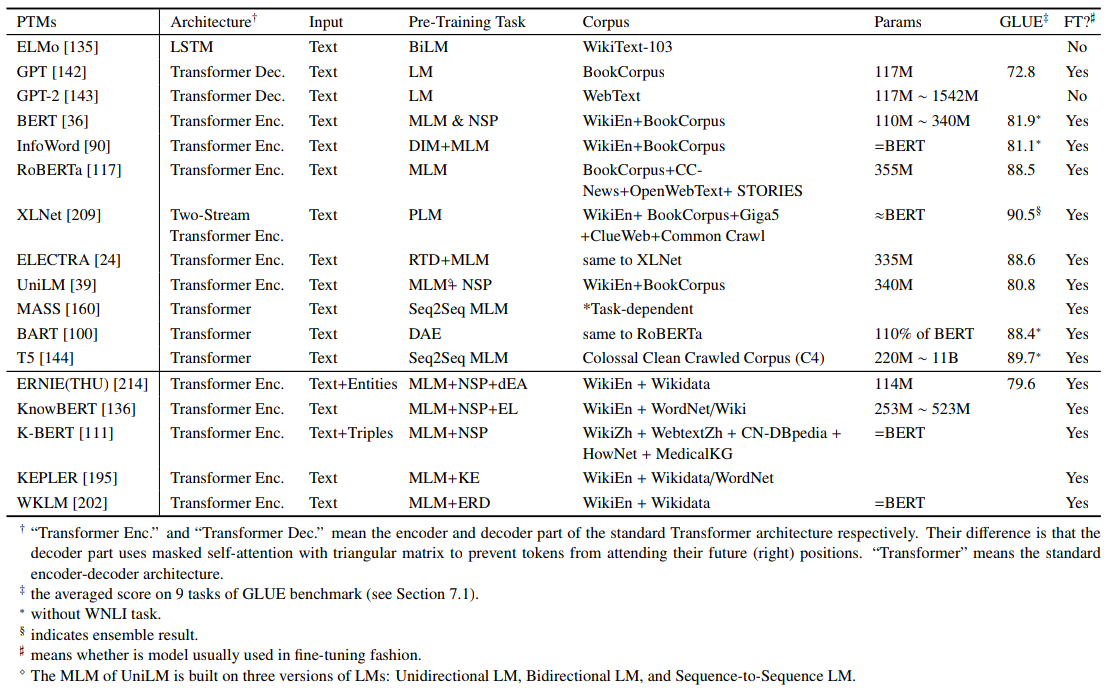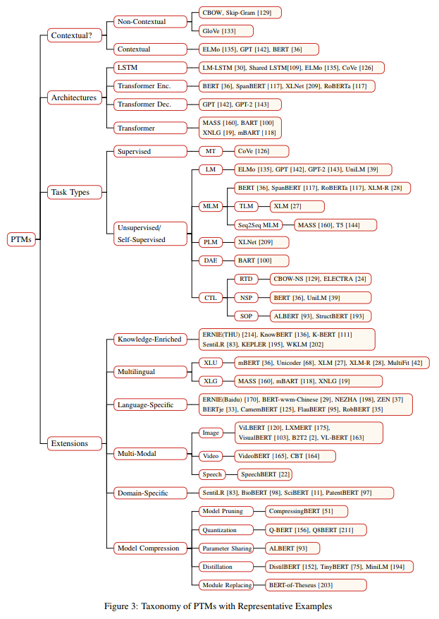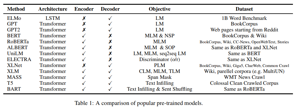 - Qiu et al 2020 - Pre-trained Models for Natural Language Processing: A Survey Nice tables of pretraining methods on page 9 and 10, see Taxonomy of Pretraining Methods below.