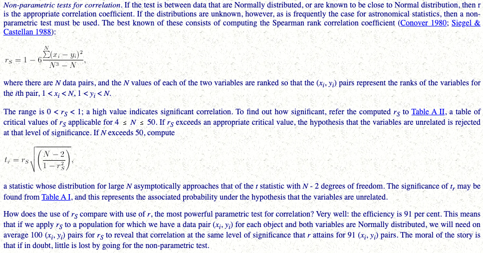 - See Correlation testing. Recommends Spearman rank correlation coefficient, below: